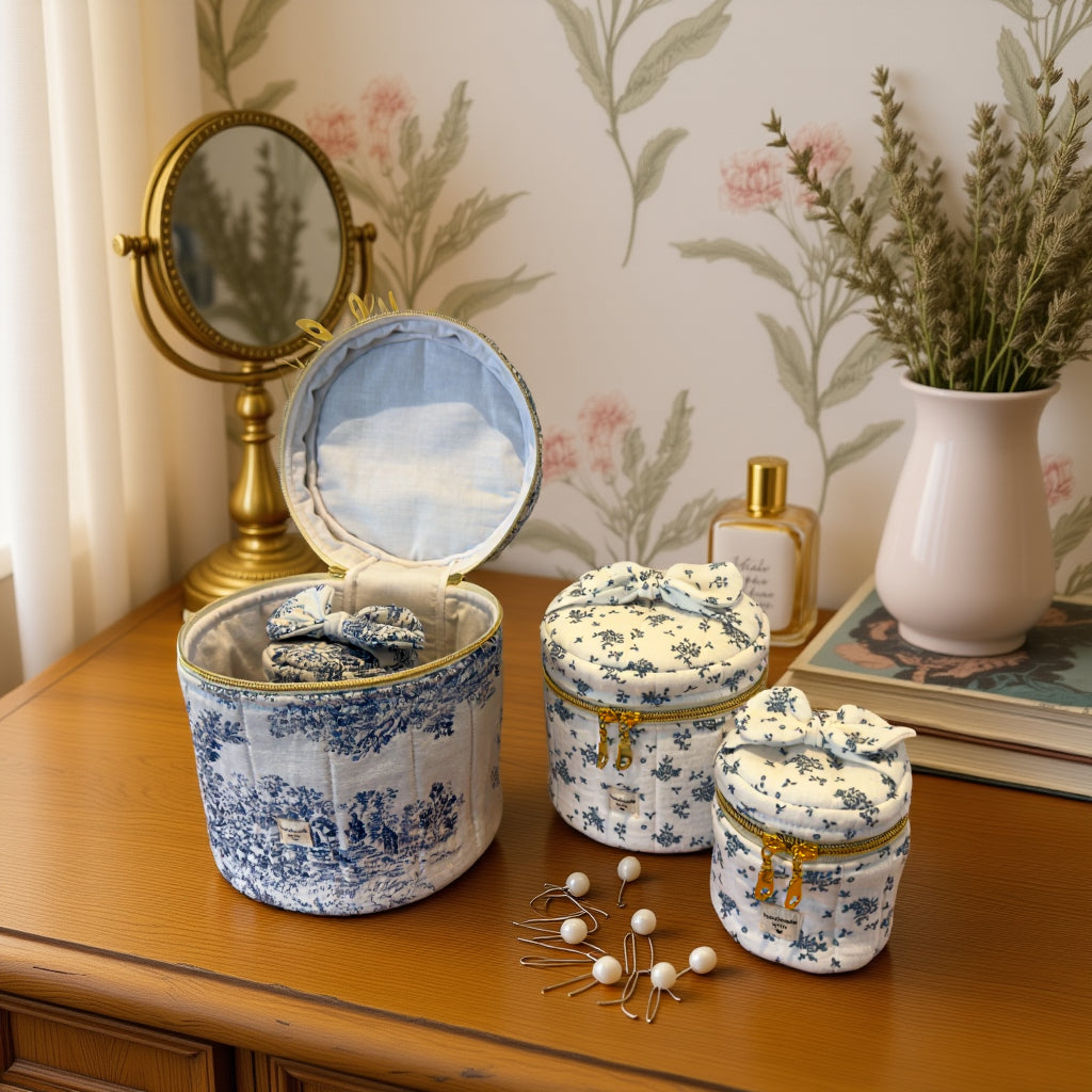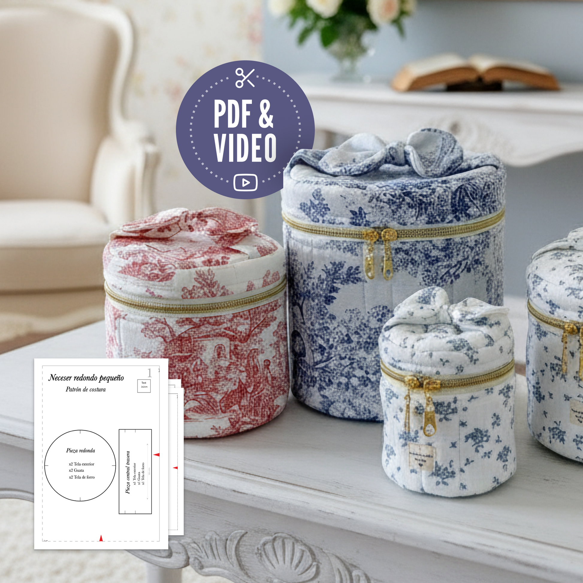 Patrón de costura neceser redondo acolchado con asa, lazo decorativo y forro, 3 tamaños